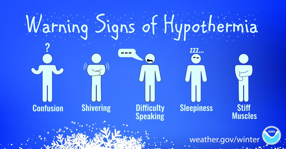 Hypothermia is a serious condition that occurs when your body temperature sinks below 96°F. It requires immediate medical attention. Symptoms of hypothermia include: shivering, exhaustion, confusion, memory loss, drowsiness, and slurred speech. Always dress in layers for cold weather, and pay attention to your body when outdoors.