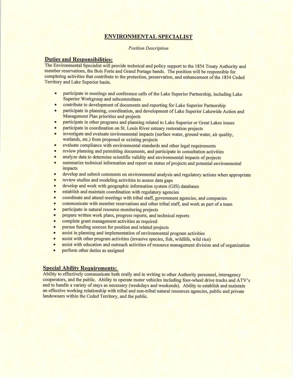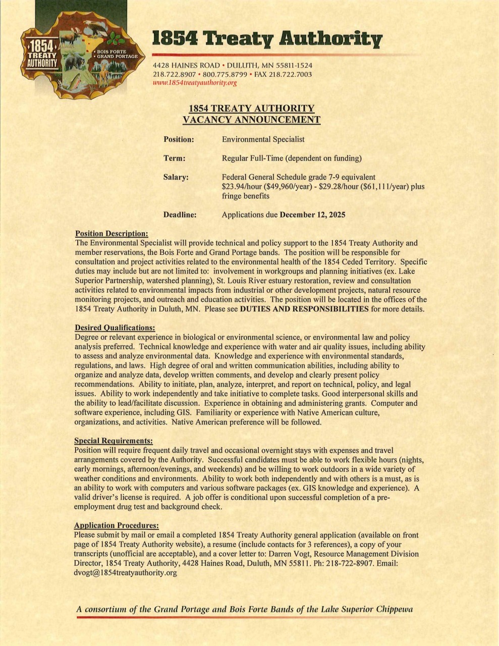 1854 Treaty Authority's Resource Management Division is hiring an Environmental Specialist. This vacancy closes December 12th, 2025.