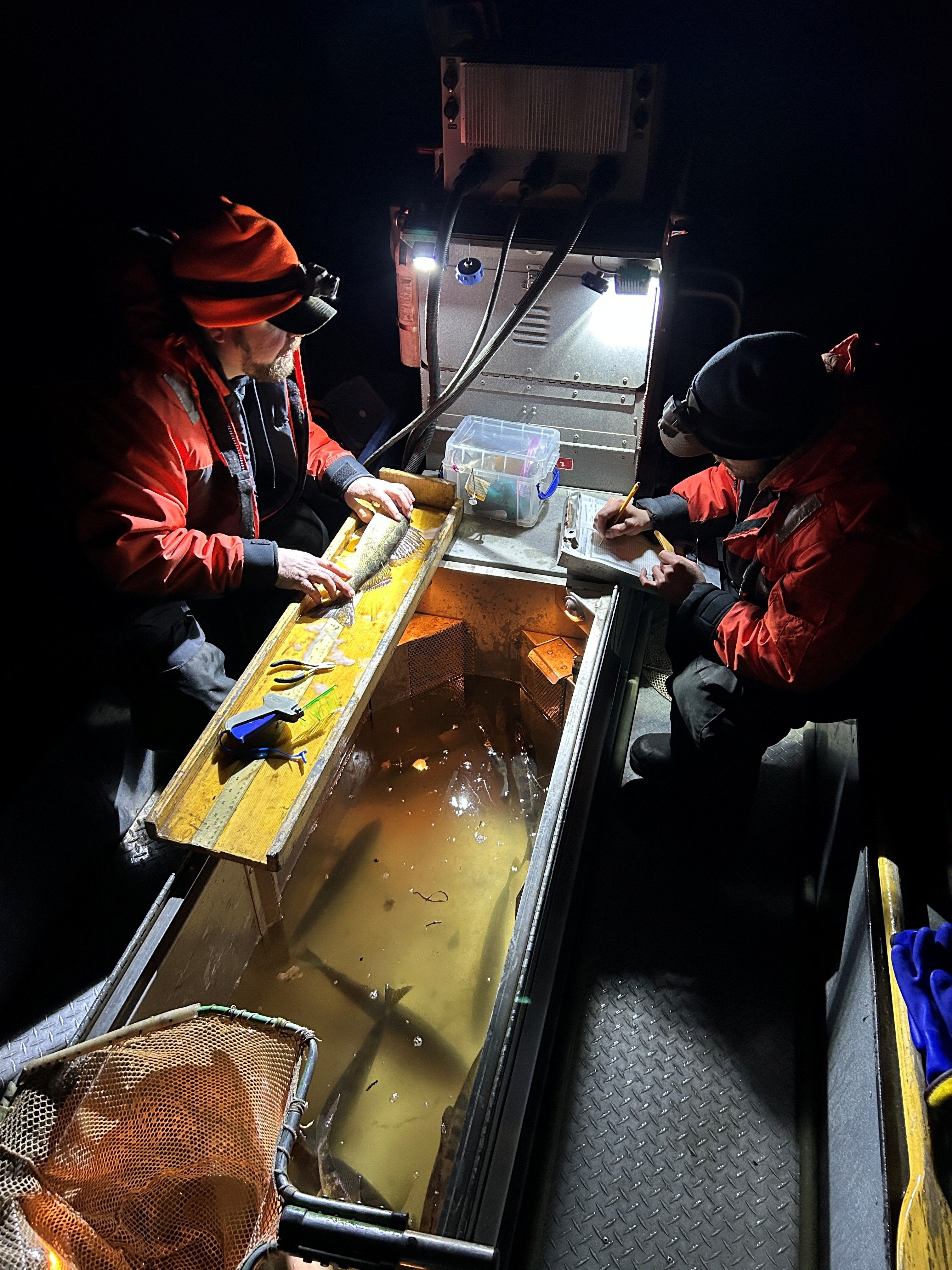 In 2011, the first documented naturally reproduced larval Lake Sturgeon were captured during a drift netting survey below the Fond du Lac dam on the St. Louis River. From 2011-2024, 1,641 larval sturgeon have been captured in these drift net surveys. In the 2025 drift net survey, over 45,000 larvae were sampled. As promising as this may seem, a variety of factors could have led to this influx of captured individuals (timing, good year class, placement of nets, etc). Future surveys will confirm if this is a sign of improved reproductive success to come, or if this year was an anomaly. Although this confirms successful natural reproduction within the estuary, there has been a limited number of recently documented juvenile sturgeon in the river. This could be due to a variety of factors (contaminants, lack of females of spawning age, genetics, high egg/larvae predation, sample gear types-typically are more selective towards adults, etc). Hopefully this is the start of promising things to come.