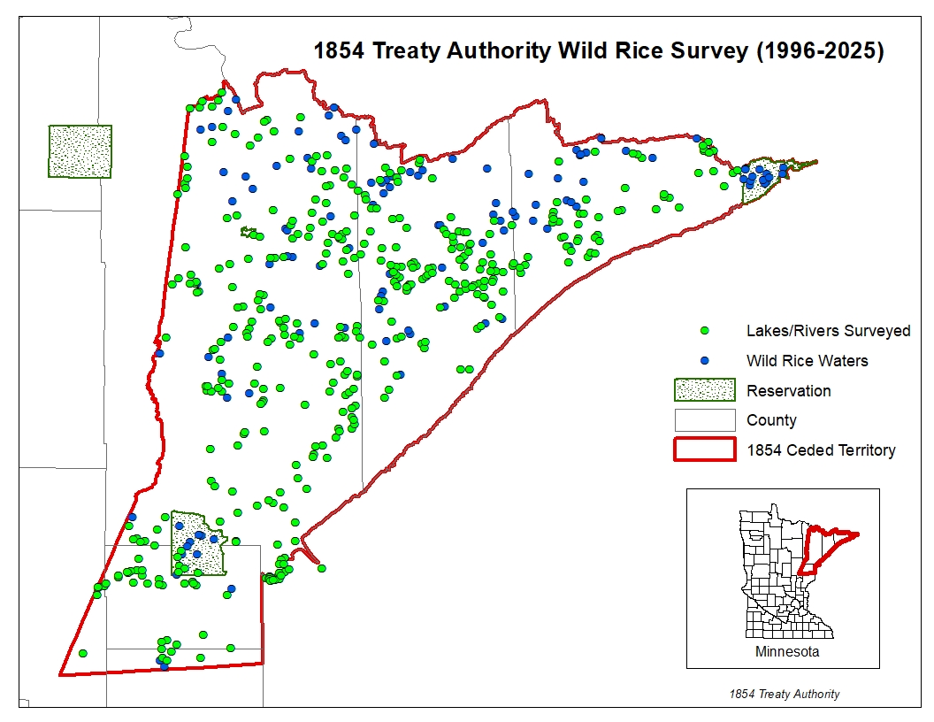 The 1854 Treaty Authority has conducted wild rice surveys since 1996. The purpose of these ongoing surveys is to determine the presence of wild rice on lakes and rivers in the 1854 Ceded Territory. The 1854 Treaty Authority has compiled a list of wild rice waters within the 1854 Ceded Territory. This list of 532 lakes and river stretches serves as an inventory of rice waters, and as the foundation for the wild rice survey. During the survey, general information about each lake or river is also recorded to determine areas where habitat may be suitable for wild rice.